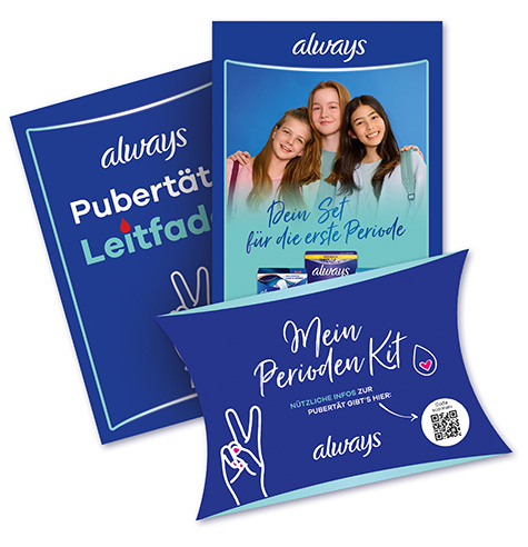 Die Perioden Kits sind kostenlose Einsteigerpakete für Mädchen zum Kennenlernen und Ausprobieren von Monatshygieneprodukten.